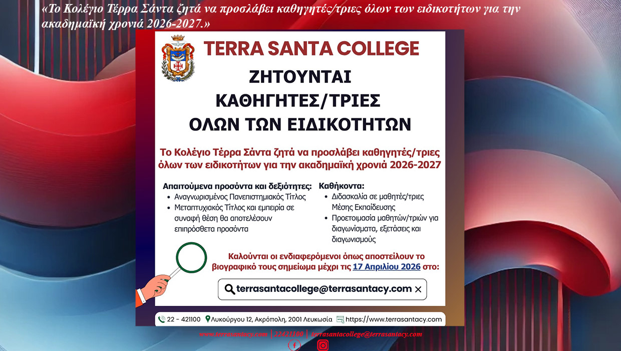 Το Κολέγιο Τέρρα Σάντα ζητά να προσλάβει καθηγητές/τριες όλων των ειδικοτήτων για την ακαδημαϊκή χρονιά 2026-2027. Για προβολή αρχείου, πατήστε εδώ: https://www.facebook.com/photo?fbid=1731798421117059&set=a.661167354846843 https://www.instagram.com/p/DWqqMH9jQDx/?hl=en