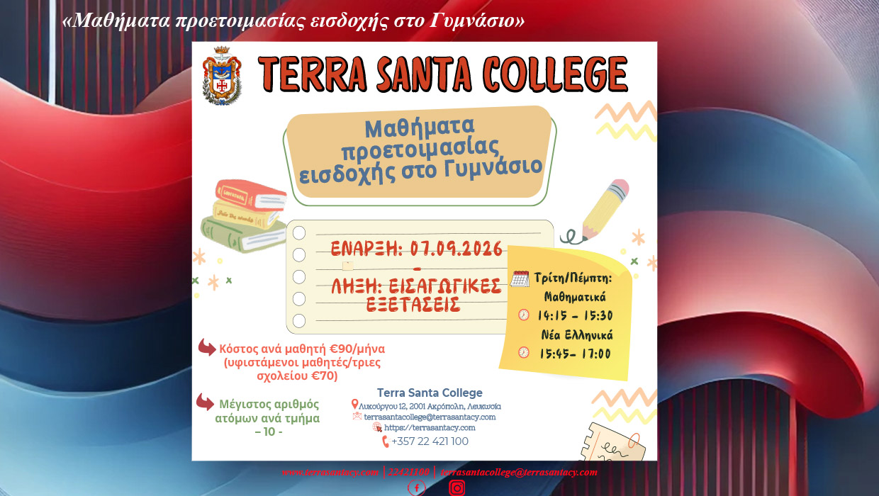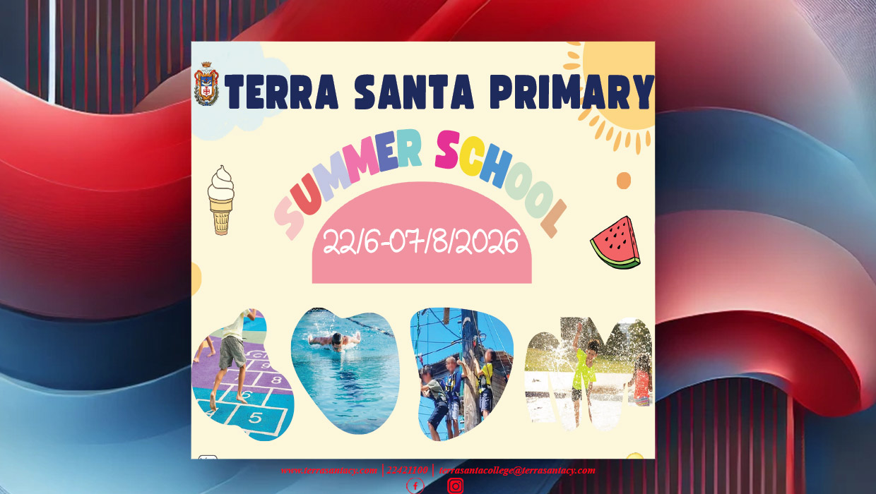 Αγαπητοί Γονείς και Κηδεμόνες, Tο “Terra Santa Summer School” έπειτα από την πολύχρονη επιτυχία του, θα λειτουργήσει και φέτος, ανανεωμένο με νέες δραστηριότητες υποσχόμενο στιγμές δημιουργικότητας αλλά και ξεγνοιασιάς...